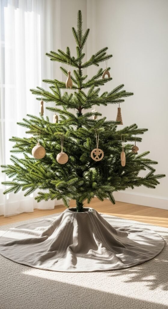 Linen brings a calming, natural feeling to your tree area. The gentle wrinkles and matte surface look especially beautiful in sunlight. Scandinavian decor leans into neutral palettes, so this skirt works well with wooden ornaments, straw stars, and delicate white lights. If you prefer a handcrafted version, use medium-weight linen and stitch a clean border around the edges. Add linen-wrapped presents for consistency. The simplicity of the fabric helps the tree feel grounded without drawing attention away from ornaments. This is a great option for anyone who likes understated holiday spaces. The warm simplicity of linen always gives the room a balanced, peaceful mood.