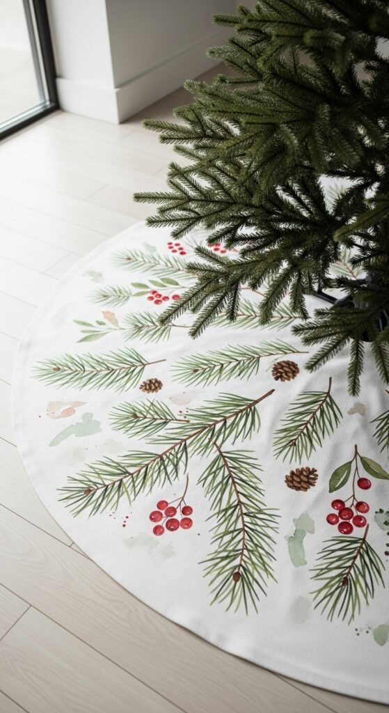 A hand-painted canvas skirt lets you express your creativity. You can paint branches, stars, holly, or anything that reflects your style. Watercolor paint creates a soft spread of color, while acrylic gives bold edges. This material also holds shape well around the tree stand. Pair it with red, green, or natural ornaments for harmony. If you want a crisp look, outline your design with fine-tip brushes. This is also a fun family project—each person can paint a small section. Canvas feels sturdy, practical, and personal. Add a few simple gift boxes to keep the attention on the artwork. The custom detail makes your holiday space feel truly one of a kind.