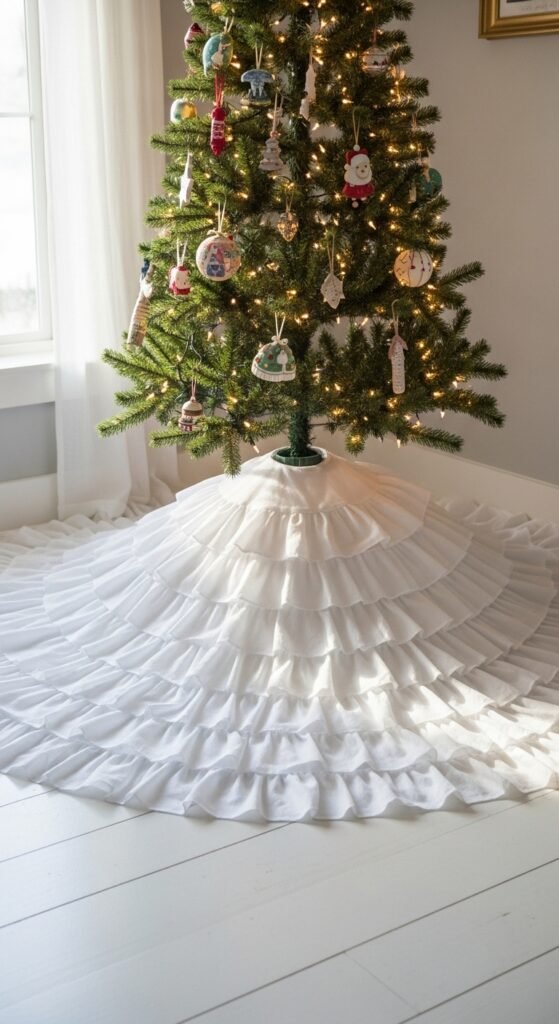 Ruffles add gentle movement around the base of your tree. The layers look soft and airy, especially in bright rooms with cottage or feminine decor. You can make one with cotton, muslin, or even repurposed sheets. Keep the layers slightly uneven for charm. Pair the skirt with pastel ornaments, frosted baubles, or soft metallic pieces. This style brings a light, romantic feel to your tree area. If you want a fuller look, stack extra layers or use interfacing for stiffness. Gifts wrapped in soft tones like blush, ivory, or mint work beautifully. The skirt creates a soft visual frame without overpowering the room.