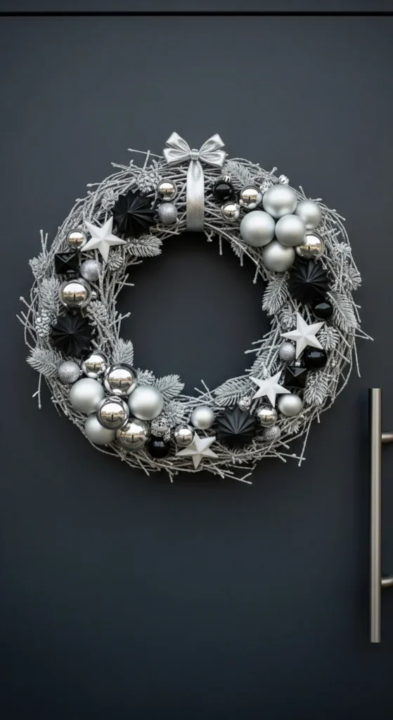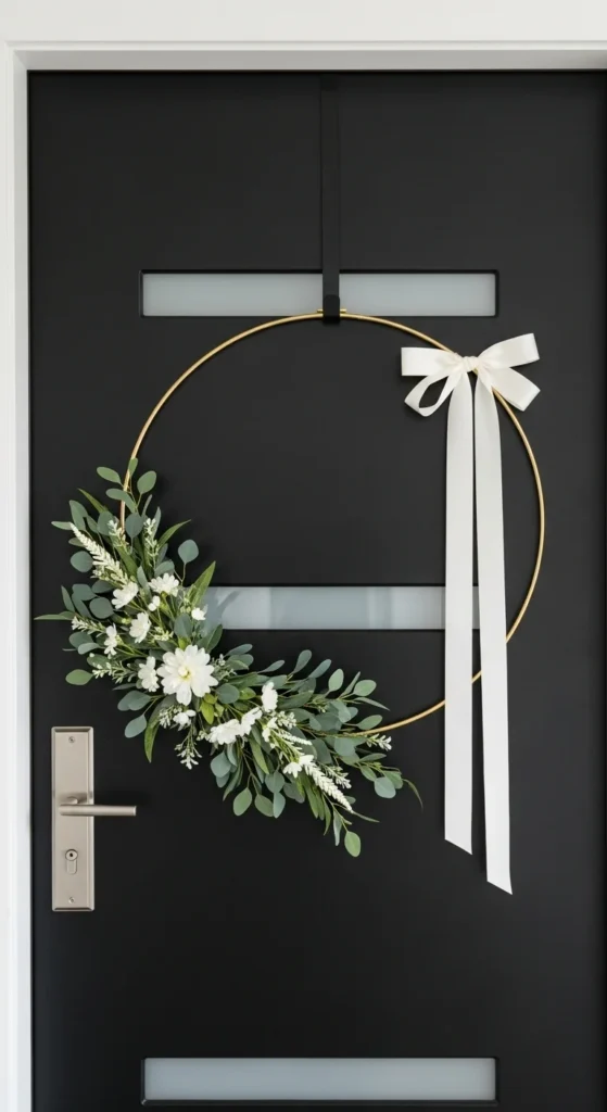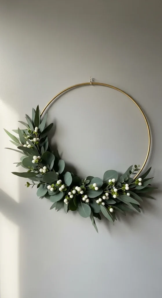 Minimalist decor lovers will adore this modern wreath. Use a metal hoop (available at any craft store) and secure eucalyptus stems around half of it with floral wire. Leave the other half exposed for a clean, artistic look. Add a silk bow or small ornament cluster for a subtle holiday hint. It’s stylish, affordable, and effortlessly chic.
