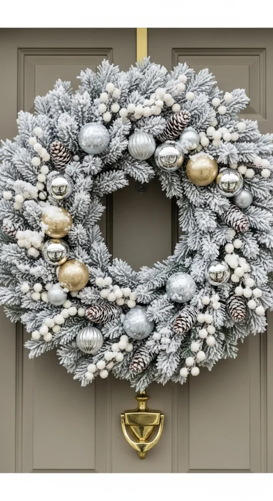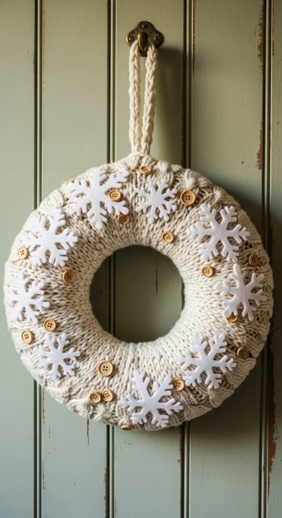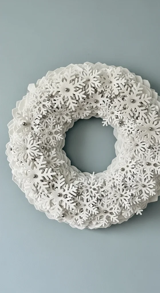 Soft and charming, this DIY is great for crafters. Cut snowflake shapes from felt and layer them over a foam or cardboard base. Glue on silver beads or sequins for sparkle. The result is a lightweight wreath that feels delicate and elegant — perfect for windows, doors, or even nursery decor.