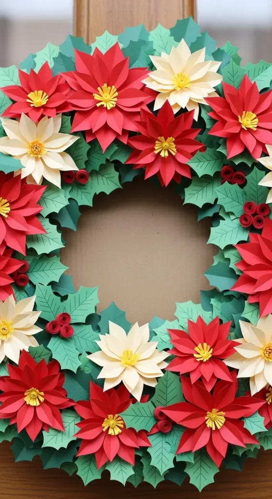 Paper crafting fans will love this one. Cut poinsettias, holly, and leaves from colored cardstock. Layer them onto a cardboard base with glue for depth. Add glitter or pearls at the flower centers. It’s lightweight and costs almost nothing, yet the result looks cheerful and creative — a fun DIY for kids and adults alike.