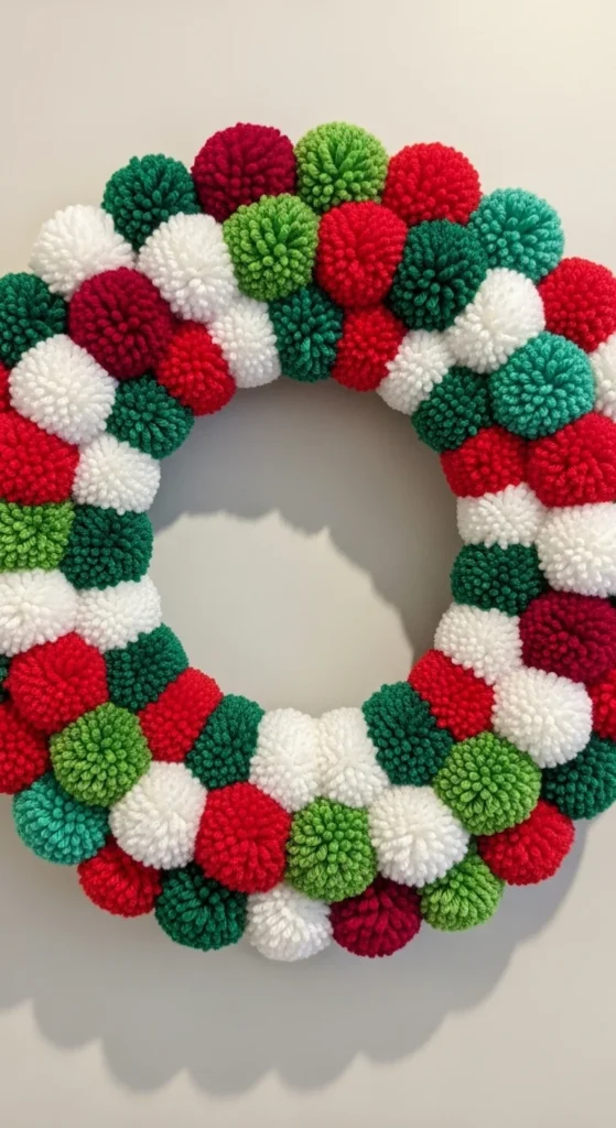 Pom-poms make for a fun and cozy wreath. Use leftover yarn to create fluffy pom-poms in festive colors, then glue them onto a foam ring. The result is cheerful and soft — perfect for playrooms or kid-friendly spaces. It’s an inexpensive craft that adds instant personality to your decor.
