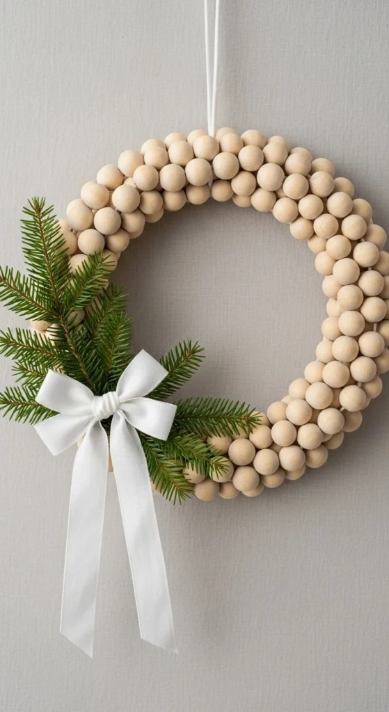 Beaded wreaths are stylish and minimal. String wooden beads onto wire or twine, then shape it into a circle. Add greenery and a soft ribbon bow for accent. It’s a neutral, Scandinavian-style wreath that fits modern homes perfectly. Bonus: it takes less than 30 minutes to make and costs under $10.