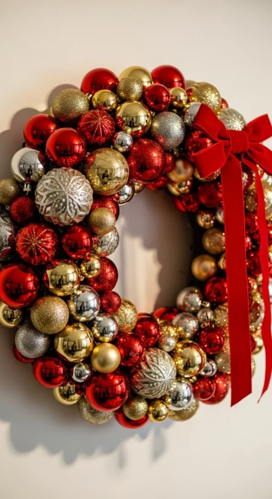 This DIY is great if you love a modern aesthetic. Choose ornaments in two or three coordinating shades. Glue them in tight clusters around a foam or wire frame for a sculptural look. Metallic finishes create reflection and depth. It’s easy, fast, and perfect for minimalist holiday themes.