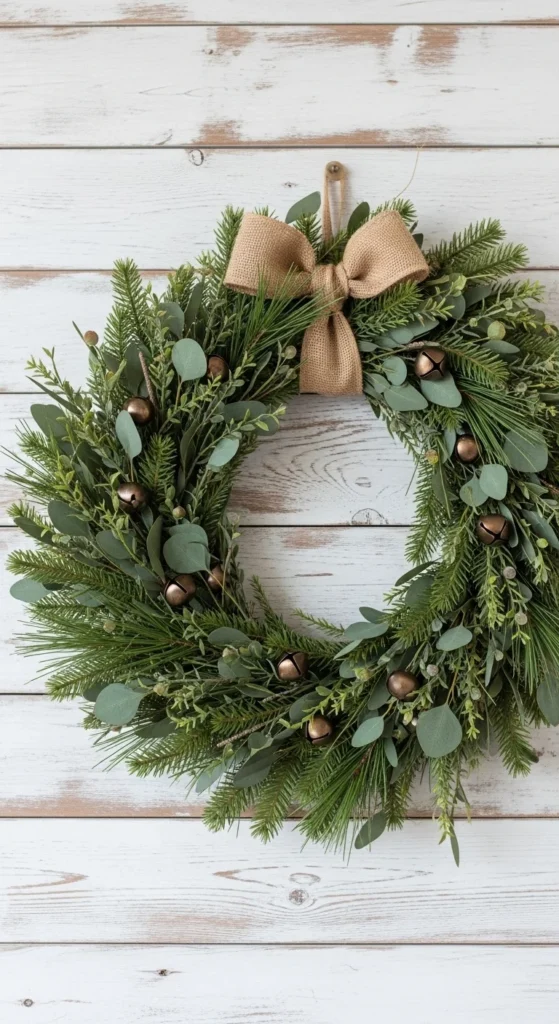 This project combines texture and sound. Attach small bells to a grapevine base with twine, then layer eucalyptus and pine for greenery. Finish with a burlap bow. It’s simple, durable, and feels straight out of a cozy farmhouse catalog. Every breeze brings a soft jingle that adds to the festive mood.