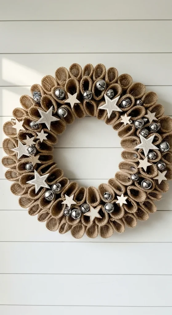 A simple yet striking design — just tie jingle bells and greenery to a hoop base using ribbon. You can find bells at dollar stores or reuse them from old decor. Add a small tag that says “Joy” or “Noel” for personality. It’s minimal, classic, and sounds as cheerful as it looks when the wind moves it.