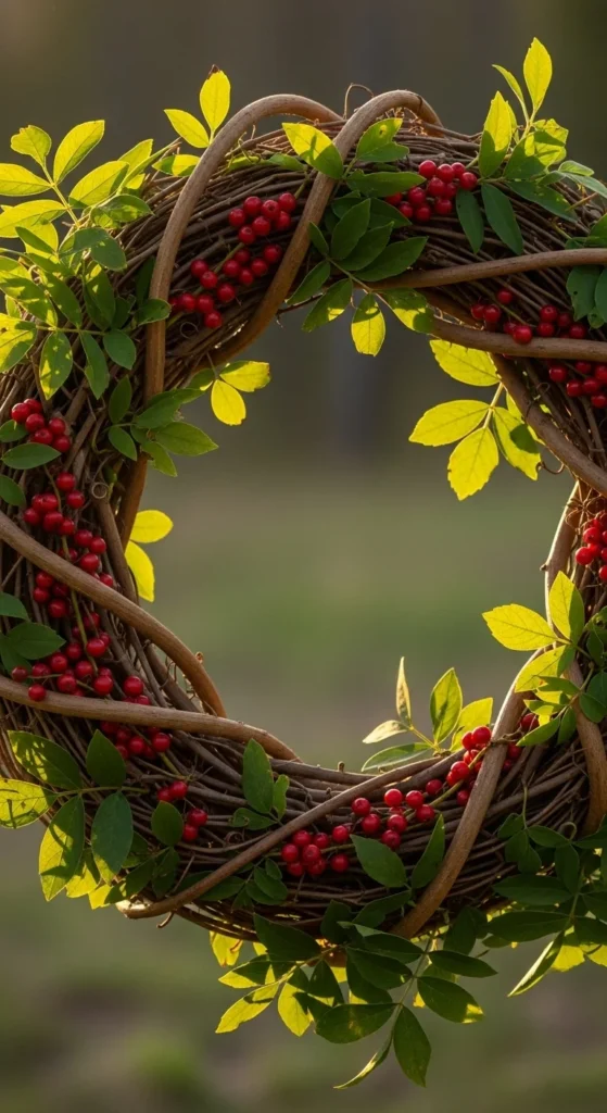You can make a rustic grapevine wreath using branches from your garden. Shape them into a circle and secure them with wire or twine. Add small clusters of berries or greenery for color. This design works beautifully indoors or outdoors and costs almost nothing. The rough texture adds authentic countryside appeal.