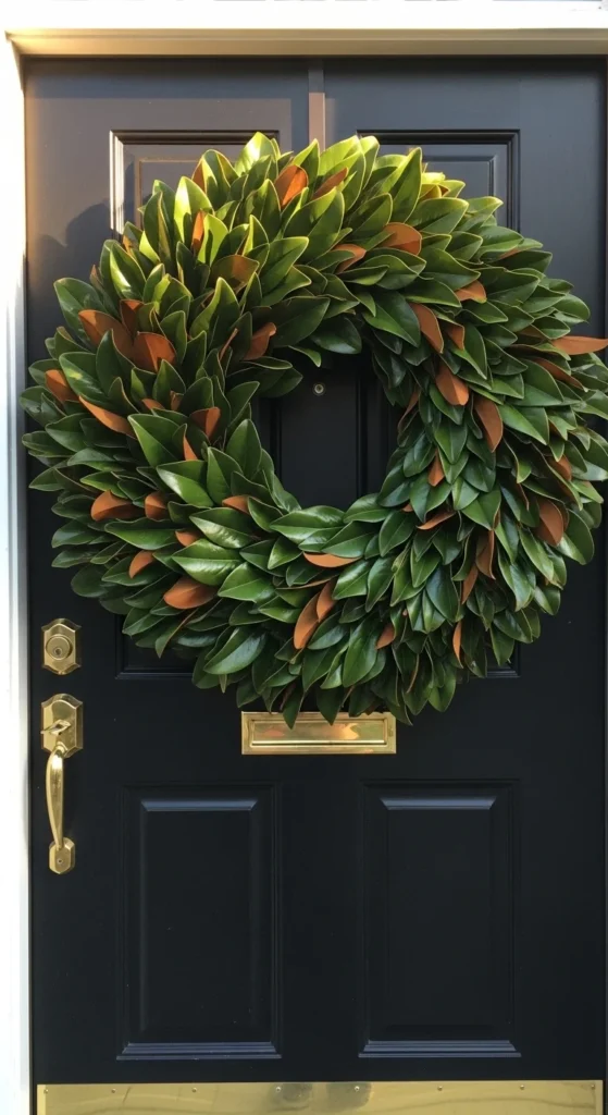 A magnolia wreath offers a natural, elegant look. The glossy leaves create soft shine. Its warm undertones pair well with wood and black doors. Choose large leaves for a fuller arrangement. For a budget-friendly version, mix real magnolia leaves with faux ones so the wreath lasts longer. Add a simple ribbon if you want extra polish. This wreath stands out without needing additional décor.