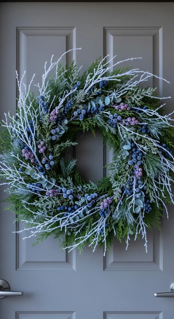 A frosted blueberry cedar wreath gives your door a cool, calming look. The muted blues blend beautifully with cedar greenery. Add icy twigs for a soft sparkle. This wreath works well with gray, navy, or black doors. If you want to craft your own, glue faux blueberries to cedar stems and lightly spray with frost paint. Keep the porch décor simple to let the wreath shine.