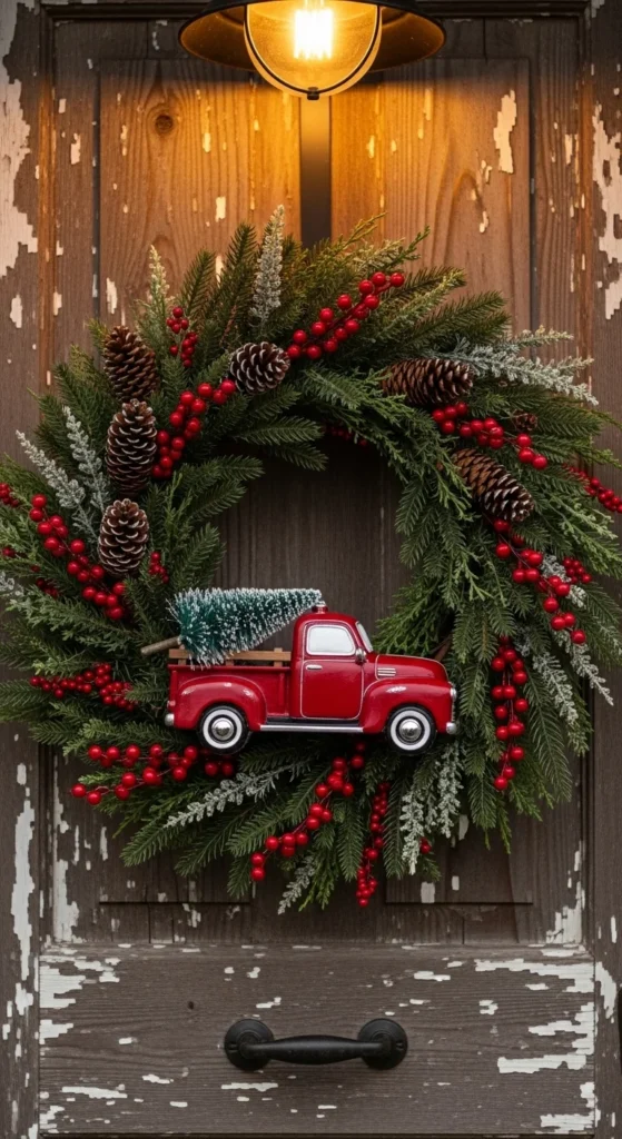 A red truck wreath adds a touch of nostalgic charm. The whimsical centerpiece becomes the highlight. Surround it with red berries or gingham ribbon. This style is great for family homes or cozy porches. For a handmade version, attach a miniature truck to the wreath base and secure it tightly. It pairs well with classic holiday porch décor like lanterns and plaid blankets.