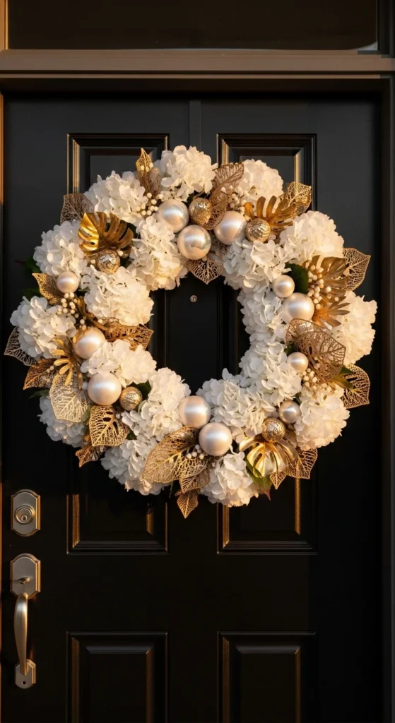 A white-and-gold wreath offers a soft, sophisticated entry. The florals add fullness while the gold details give gentle shine. Choose faux hydrangeas for durability. You can add pearl ornaments for texture. This wreath works beautifully with black, navy, or charcoal doors. Keep your porch décor minimal to let the wreath be the star.