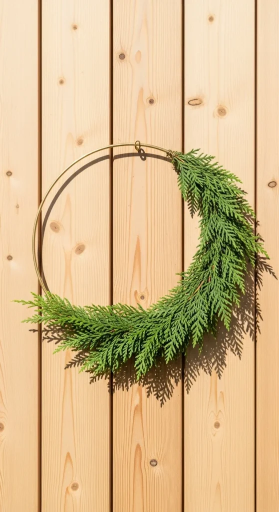 A minimal Scandinavian wreath creates a calm, clean statement. Only decorating half the hoop keeps it modern. Choose cedar or eucalyptus for soft movement. This wreath works especially well on wood doors or modern homes. For a DIY option, wrap greenery around one side and secure with floral wire. A simple ribbon tie can add warmth without cluttering the design.