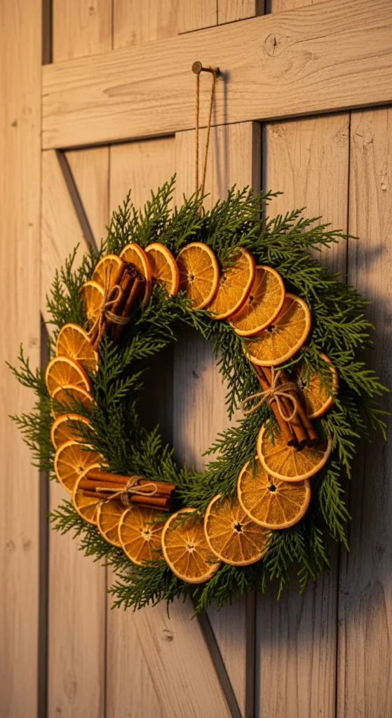 A citrus-and-cedar wreath brings a cozy, old-world charm to your entry. The dried oranges add soft color and scent. Cinnamon sticks make it feel warm and festive. This wreath works beautifully with wood doors or neutral porches. To make one yourself, dehydrate orange slices in the oven and tie them with twine onto a greenery base. Add cloves for extra detail.