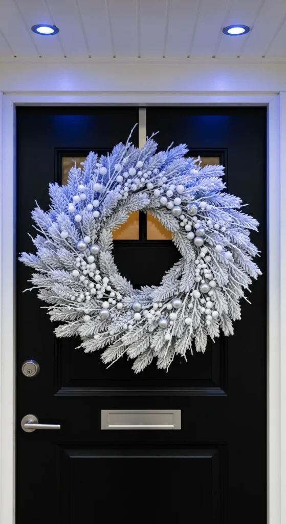 A snowy white wreath gives your front entrance a calm, wintry glow. The frosted branches create soft texture without overwhelming the space. Keep the palette to whites and silvers for harmony. This design works well if your home has modern or monochrome architectural lines. For a budget-friendly DIY, spray flocking onto plain branches and add silver stems from craft stores. Pair it with cool lights for a soft winter shimmer.