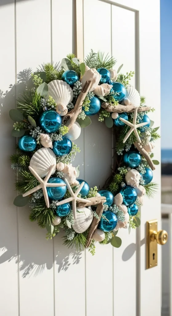A coastal wreath is perfect if you want something outside the traditional palette. The mix of blue ornaments and shells feels calm and breezy. Use driftwood pieces for texture. This style works especially well for beach homes or bright porches. For a DIY idea, glue lightweight shells onto a foam or grapevine base and mix them with soft greenery. Pair with a simple doormat to keep the focus on the wreath.