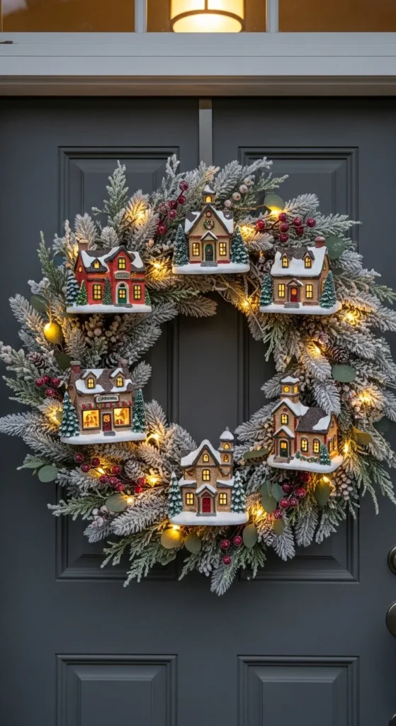 A mini village wreath turns your doorway into a tiny holiday world. The flocked houses add charm that draws eyes instantly. Use lightweight miniature houses so the wreath hangs securely. Add soft micro-lights for warmth. If you’re crafting your own, glue the houses onto a sturdy grapevine base and tuck snowy greenery around them. This wreath pairs beautifully with neutral or dark doors and creates a warm welcome for guests arriving after sunset.