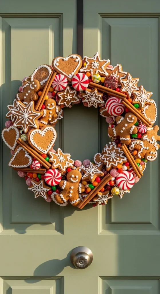 A gingerbread wreath brings cheerful, bakery-style charm to your entrance. The cookie shapes—stars, hearts, mittens—add whimsy. Use faux gingerbread pieces so the design lasts the entire season. Add cinnamon sticks or candy embellishments for fragrance and color. This wreath works especially well for family homes or porches decorated with warm lights. For a DIY version, craft faux cookies from air-dry clay and paint them with icing details.