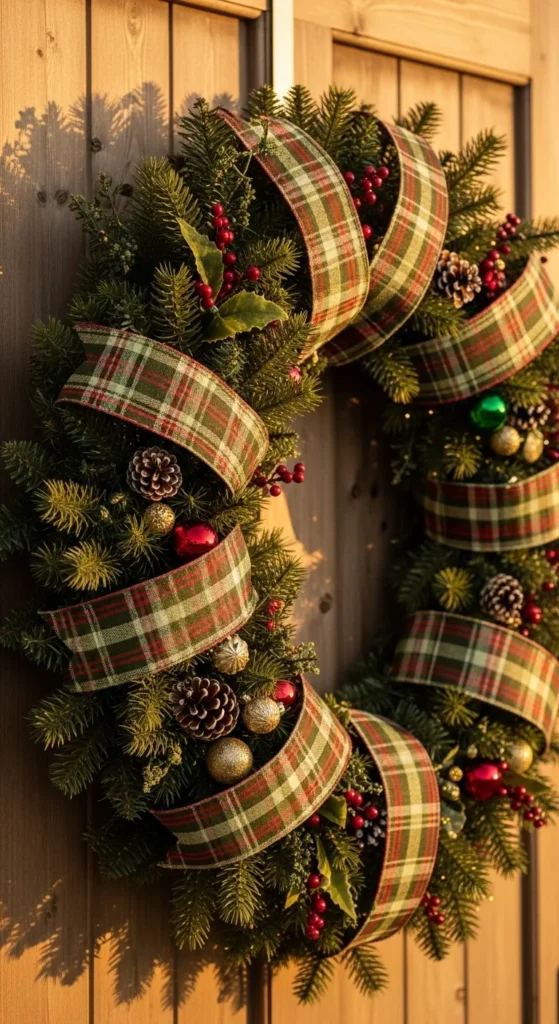 A plaid ribbon wreath gives your doorway a traditional holiday feel. The pattern adds color without overpowering the greenery. Use wired ribbon to weave gentle waves through the wreath. Add pine sprays for fullness and tuck in berries for contrast. If you’re crafting your own, start with a sturdy base so the ribbon stays in place. This design pairs beautifully with lanterns, wooden signs, and classic porch colors.