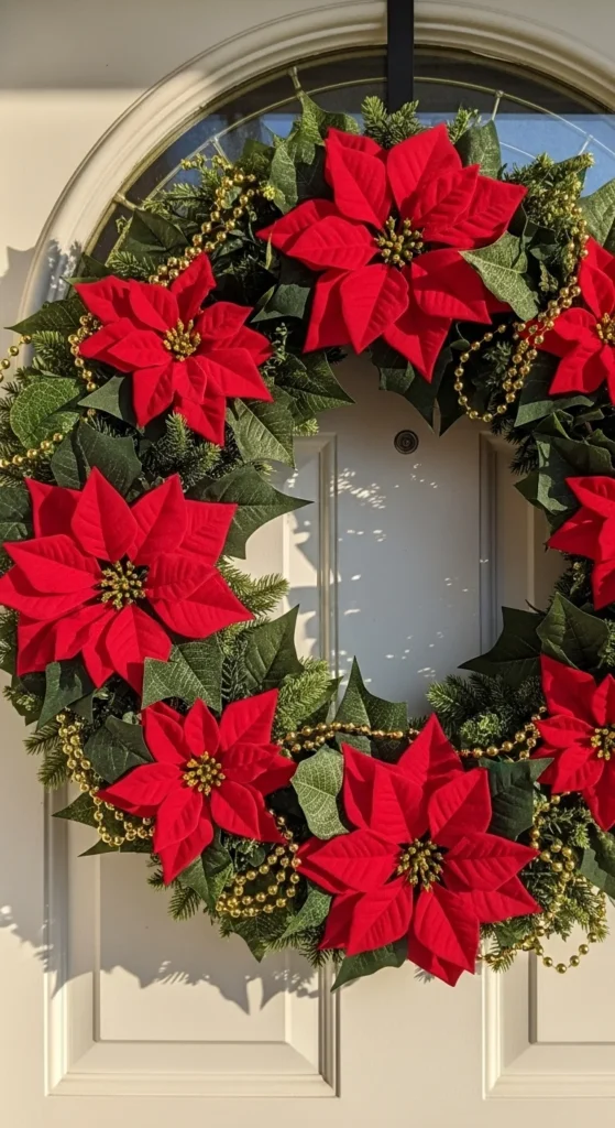 A poinsettia wreath delivers a striking floral statement for the holidays. The large blooms bring bold color and instant cheer. Choose faux poinsettias so the wreath remains bright throughout the season. Add gold beads or small ornaments for shine. This wreath works well on white or black doors where the red stands out. For a DIY idea, attach the flowers to a foam base and layer leaves behind them for structure.