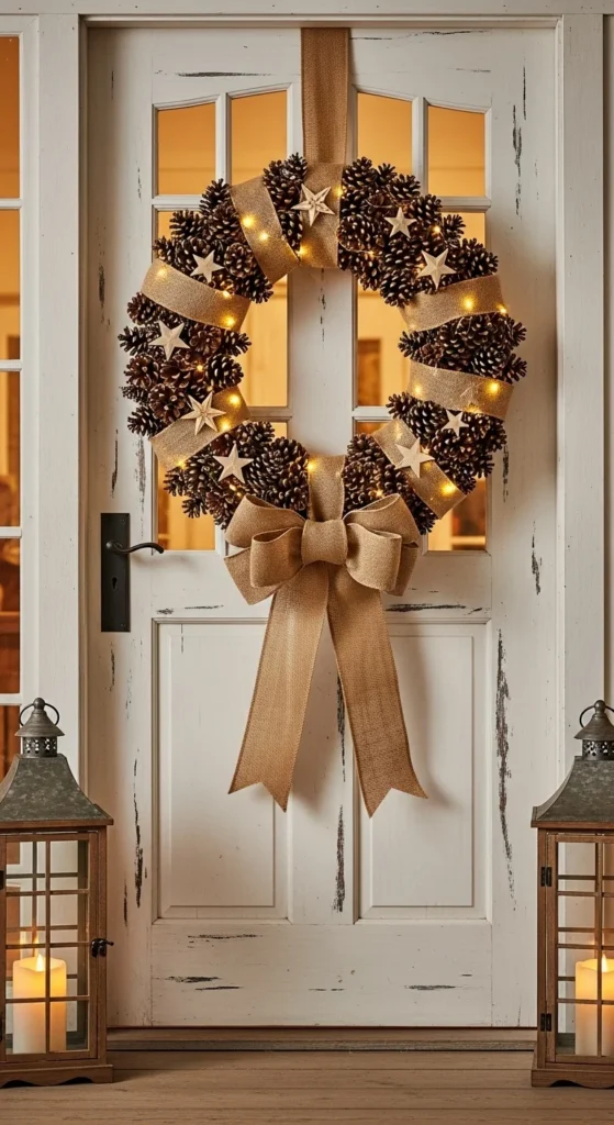A pinecone-and-burlap wreath brings a warm, rustic touch to your entry. The textures feel natural and welcoming. Use pinecones of different sizes so the design doesn’t look flat. Wrap burlap loosely for softness. Add tiny lights if you want evening sparkle. For a DIY version, glue pinecones onto a foam ring and add wood cutouts for charm. This wreath stands out beautifully on white or light-color doors.