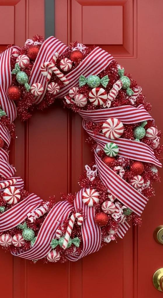 A candy cane stripe wreath brings playful holiday energy to your entrance. The bold pattern catches attention instantly. Use wired ribbon to get clean stripes. Add peppermint ornaments or tiny bells for detail. This style works especially well if your porch already includes red décor. For a simple DIY, wrap wide striped ribbon around a foam ring and glue clusters of small ornaments around the edge.