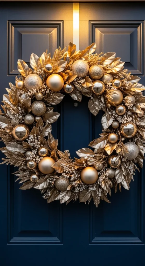 A gold and champagne wreath adds soft sparkle to your front door. The metallic tones brighten the space without feeling overwhelming. Choose a mix of matte and glossy pieces for dimension. If you want to save money, spray paint inexpensive ornaments to match the palette. A navy or black door makes the gold shine more, but it also works on white doors for a classic look. Keep the rest of your porch décor subtle to let the wreath stand out.