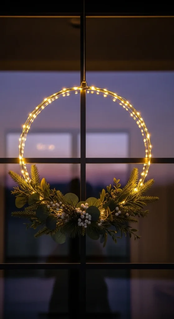 An LED light ring wreath adds a modern glow to your front door. The thin gold hoop keeps the look clean. Place a small greenery cluster at the bottom or side for balance. This wreath shines brightest at night, making it ideal for homes with darker porches. A DIY version only requires a metal hoop and micro-lights. Add eucalyptus, cedar, or pine for simple texture.