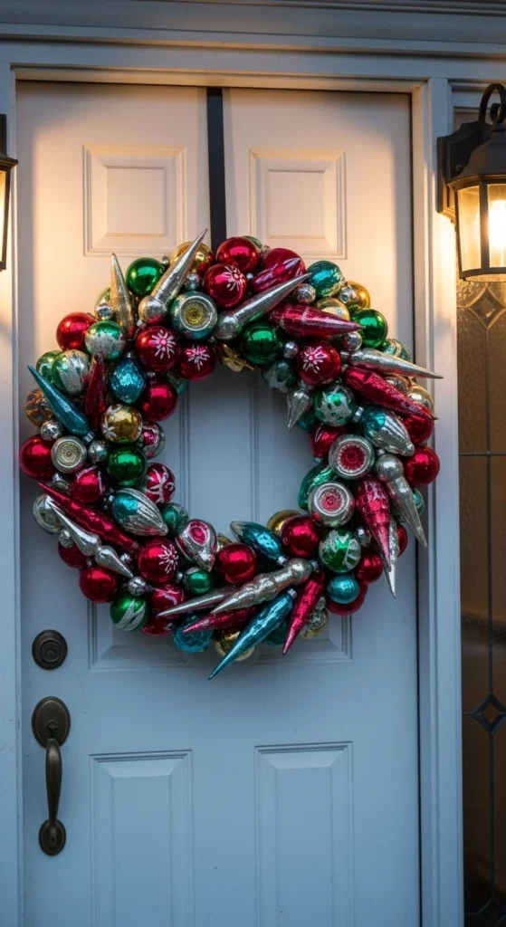 A vintage ornament wreath gives your door a nostalgic holiday feel. The mix of colors reflects the warm glow of porch lights. Use ornaments in various sizes to create dimension. For a DIY version, glue ornaments onto a foam ring densely so no gaps show. This type of wreath looks especially striking on white, black, or light blue doors. Pair with classic porch décor like lanterns and toy-soldier figurines.