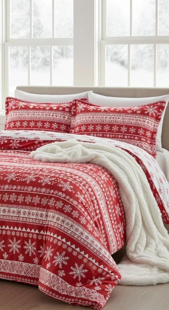 Switching your bedding for a holiday-themed set instantly changes the vibe. Choose patterns with snowflakes, stars, or holly. Pair them with a plain white duvet or a fur blanket to keep things balanced. It’s an affordable, low-effort way to refresh your space for the season.