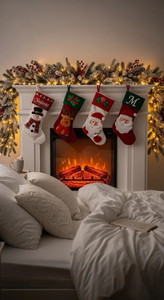 If your bedroom has a fireplace, decorate it like a cozy retreat. Hang stockings and garlands, and place candles or fairy lights inside when not in use. Don’t have one? Use an electric or faux fireplace — it gives off warmth and charm without the mess. Add a few logs or pine-scented candles for that winter-lodge feel.