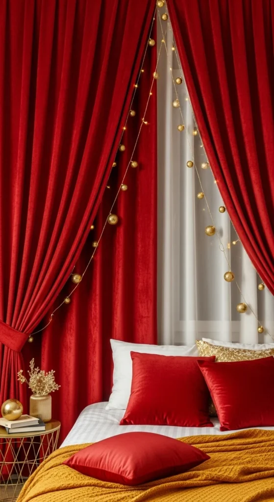 Velvet brings luxury and warmth to any room. Add red velvet touches — curtains, pillow covers, or a throw blanket. The deep color feels festive while adding texture and depth. Pair with gold accents for a regal Christmas look that still feels soft and cozy.