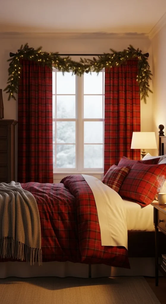 Plaid is the ultimate holiday pattern. Swap your regular curtains or pillowcases for classic tartan designs. They blend beautifully with both rustic and traditional decor. Add some greenery or mini wreaths nearby to complete the look. It’s simple but transforms the entire atmosphere into a cozy winter cabin.