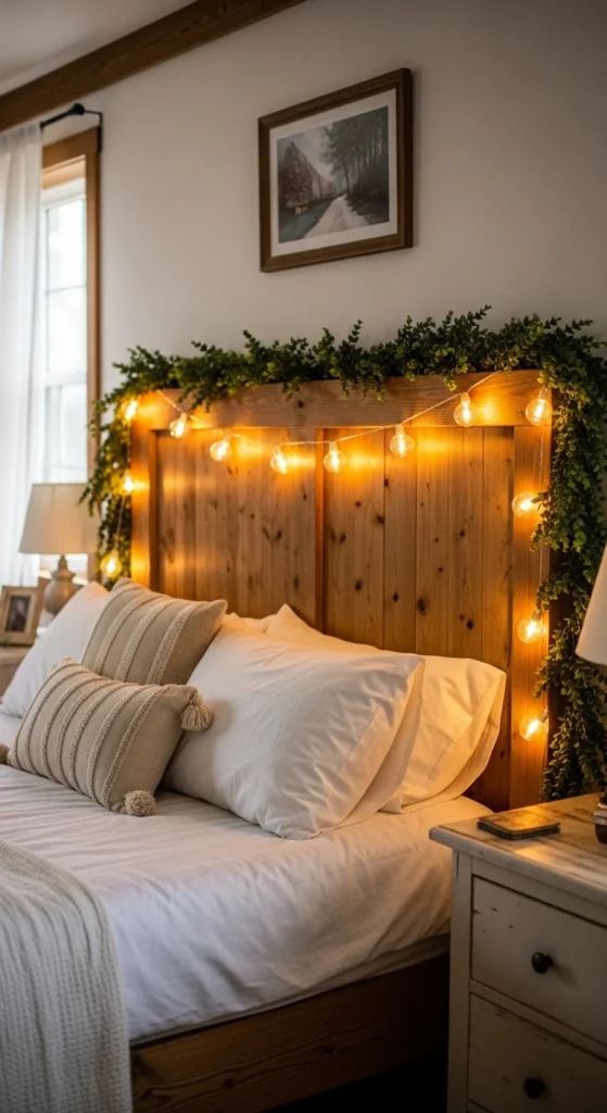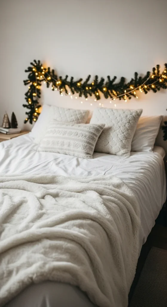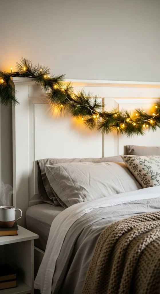 Lights aren’t just for the tree — they’re perfect for your headboard, too. Wrap string lights around your bed frame or garland for a dreamy look. Opt for warm white bulbs to create a soft glow at night. It’s an easy way to make your bedroom feel like a Christmas retreat while keeping things soothing for sleep.