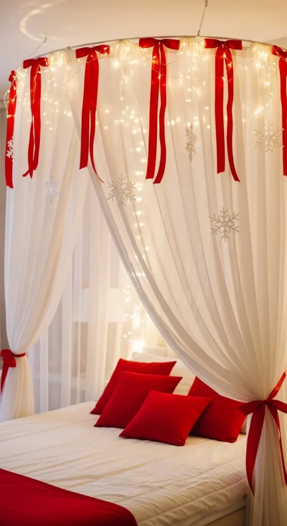 Turn your bed into a holiday sanctuary by decorating your canopy with ribbon, garlands, or paper snowflakes. Use string lights to frame the top for gentle illumination. It’s whimsical, cozy, and ideal for anyone who wants that enchanted, storybook feeling all winter long.