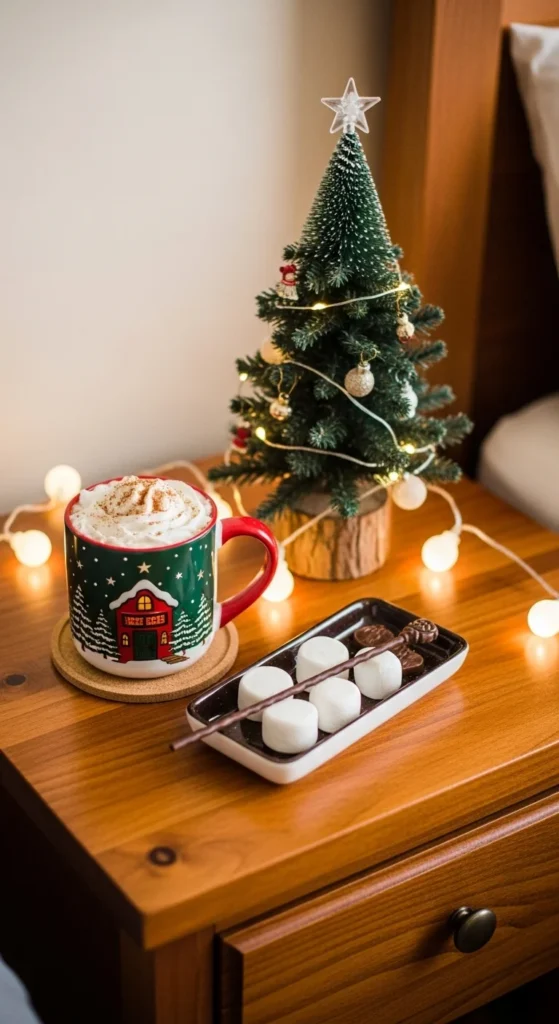 Make your own mini hot cocoa station right on your nightstand. Place a decorative tray with mugs, cocoa packets, candy canes, and marshmallows. Add a small lamp or fairy lights for glow. It’s a cozy detail that makes chilly nights extra inviting — perfect for weekend mornings or lazy winter evenings.