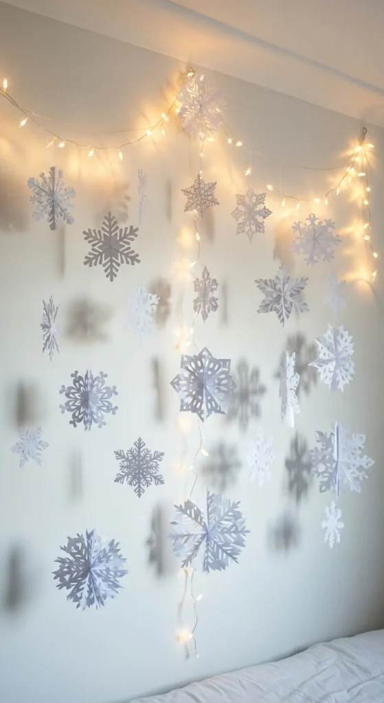 Decorate your wall with paper snowflakes for an inexpensive and fun touch. Cut various shapes from white paper and tape them in patterns around your headboard or dresser. Combine with soft fairy lights for sparkle. It’s playful, relaxing, and easy to update each season.