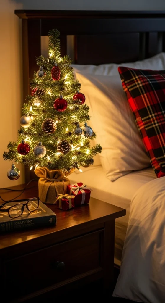 A mini tree brings holiday magic without taking up much space. Choose a small faux or real tree and decorate it with mini ornaments, fairy lights, and ribbon. Place it on your nightstand or dresser to create a festive glow. For a budget version, collect small branches and arrange them in a vase — simple, elegant, and cozy.