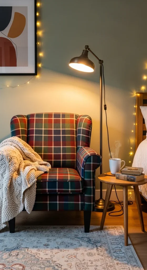 Create your own winter reading spot. Add a comfortable chair, blanket, and soft lighting to a quiet corner. Drape a garland or fairy lights nearby for ambience. It’s a relaxing retreat for sipping cocoa, reading, or simply winding down before bed — your personal slice of Christmas calm.