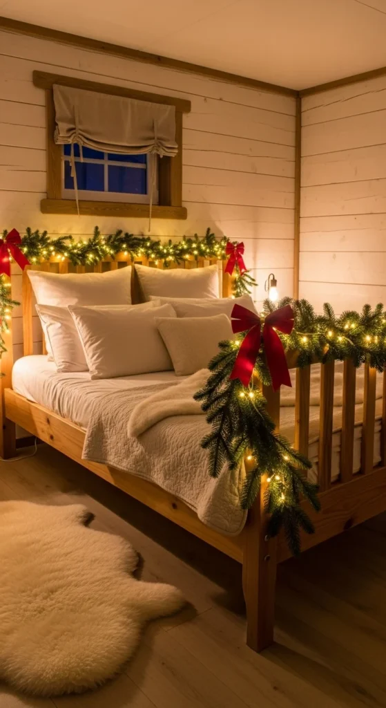 Adding a lit garland above your bed creates a soft, magical glow. Use battery-powered lights to keep things tidy. Add pinecones, ribbon, or faux snow for texture. The light is gentle enough for nighttime and adds warmth that feels calm and festive — like falling asleep under Christmas lights.