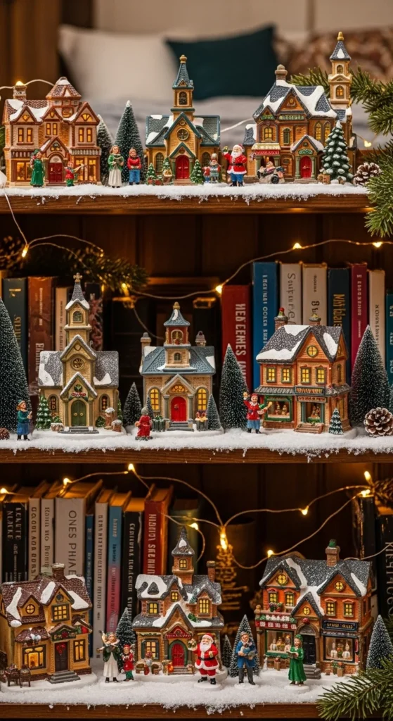 Bring a little nostalgia to your bedroom with a mini Christmas village display. Use your bookshelf or dresser top as a base. Arrange small houses, figurines, and trees, then sprinkle faux snow or cotton for a wintery effect. Add string lights underneath for a soft glow. It’s an affordable decor project that turns your space into a tiny Christmas wonderland.