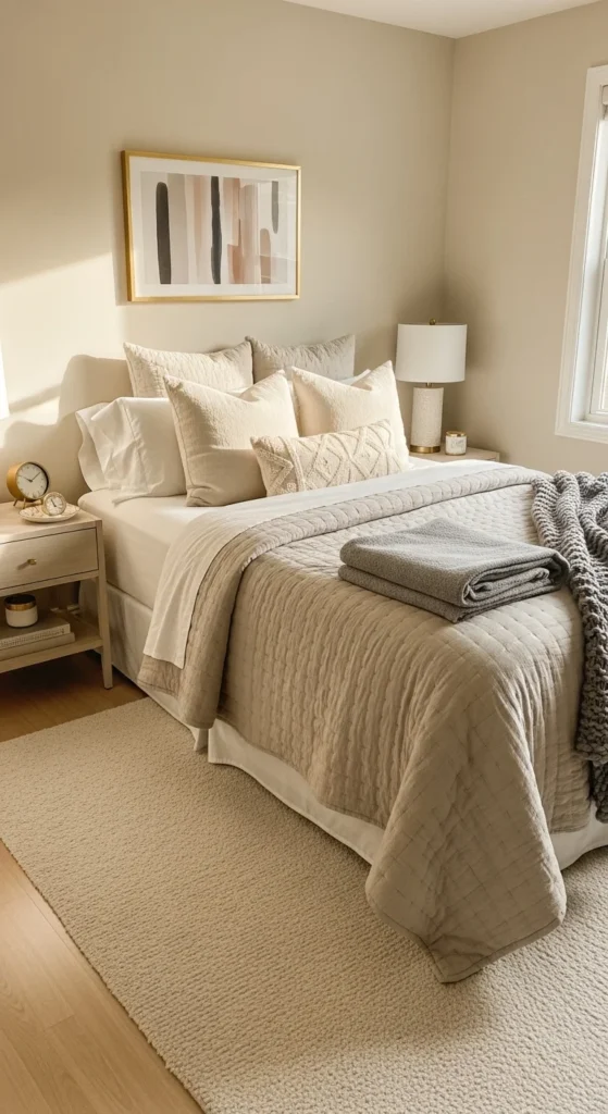 Not all Christmas bedrooms need color. A neutral palette with whites, creams, and tans feels peaceful and refined. Layer textured materials like knits, linen, and faux fur to add warmth. Add small touches like gold ornaments or clear lights for subtle shine. This minimalist approach creates calm, cozy elegance without feeling overly themed.