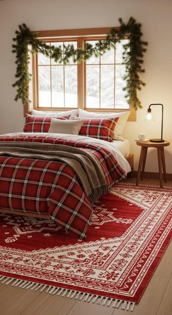 Flannel instantly makes a space feel warm. Swap out your regular sheets for plaid flannel bedding in festive colors like red, green, or cream. Layer with chunky knit blankets and faux fur throws for texture. Add a few velvet or tartan pillows to tie it all together. The layered look not only adds warmth but gives your bedroom that classic Christmas cabin charm.