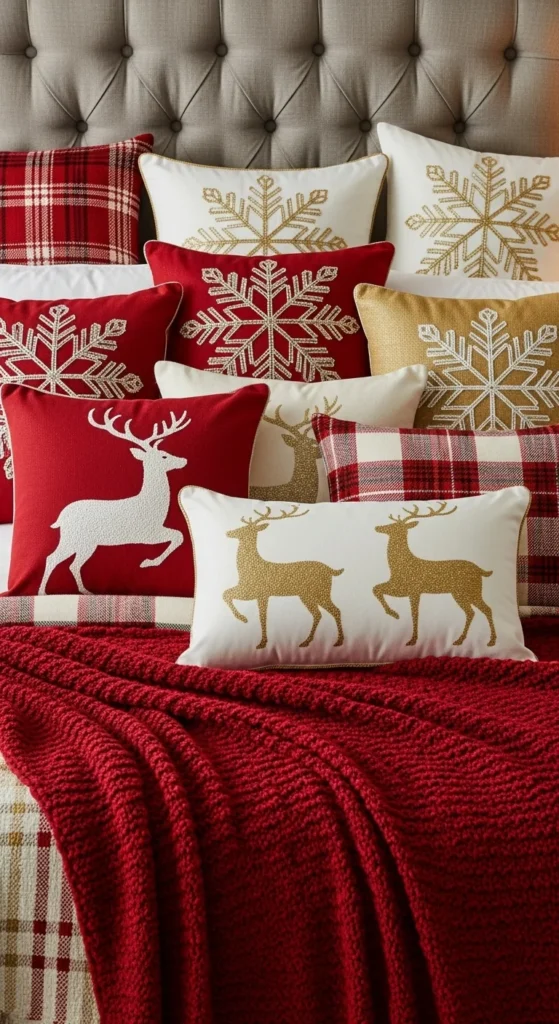 Switching out pillows is one of the fastest ways to refresh your bedroom for the holidays. Go for holiday-themed pillow covers — snowflakes, reindeer, or tartan prints. Mix textures like velvet, faux fur, and embroidery for a rich feel. If you’re saving money, just buy pillow covers instead of new inserts and swap them seasonally.