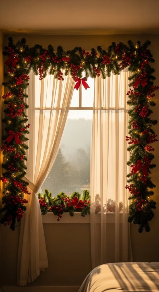Framing your windows with evergreen garland adds instant holiday spirit. You can use faux garland for longevity or real greenery for that pine scent. Weave fairy lights and berry sprigs for color. It’s a simple project that transforms any window or mirror into a festive focal point while adding a touch of natural beauty.
