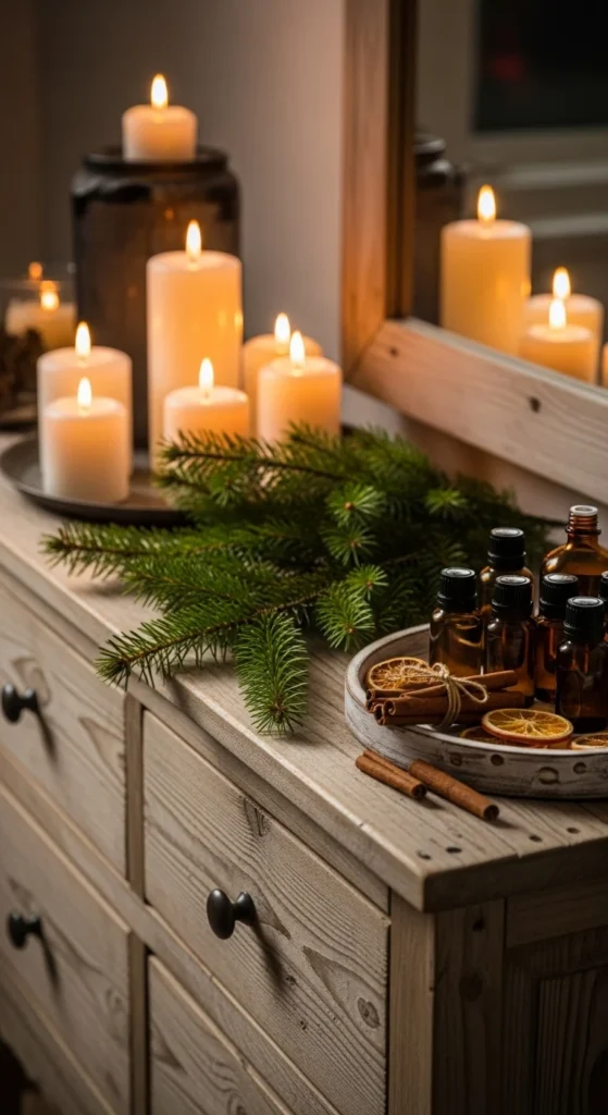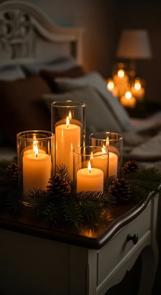 Candles make any bedroom feel calm and warm. Arrange clusters of candles on your nightstand or dresser — mix pillar, taper, and tea lights in clear glass holders. Add greenery or pinecones for a holiday touch. For safety, use LED candles; they offer the same soft flicker without worry. The result is cozy, romantic, and peaceful.