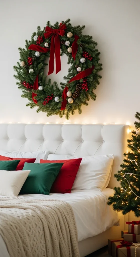 A wreath doesn’t just belong on the front door. Hang a Christmas wreath above your bed to act as a statement piece. Choose one that matches your bedroom’s color palette — green and gold for elegance, or red and plaid for rustic warmth. It’s an effortless way to create that festive focal point.