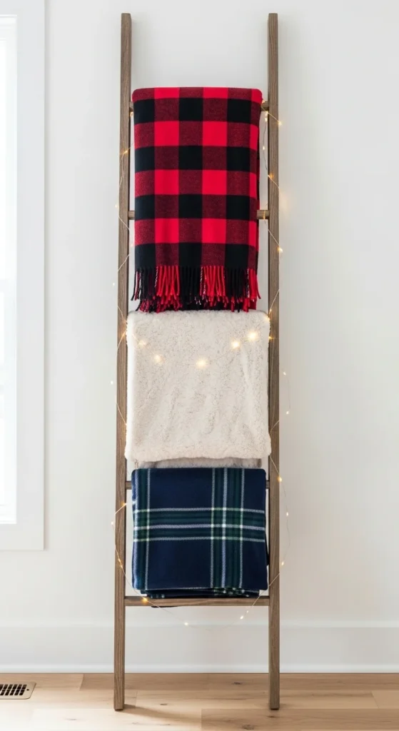 A blanket ladder is both functional and decorative. Drape plaid and cable-knit throws over it for texture and warmth. Wrap fairy lights around the rungs for a magical evening glow. It’s an easy DIY project that adds storage while creating that cabin-in-the-snow atmosphere you’ll love curling up in.