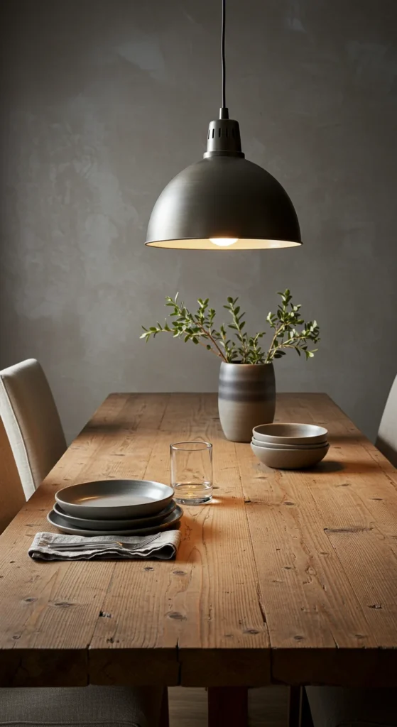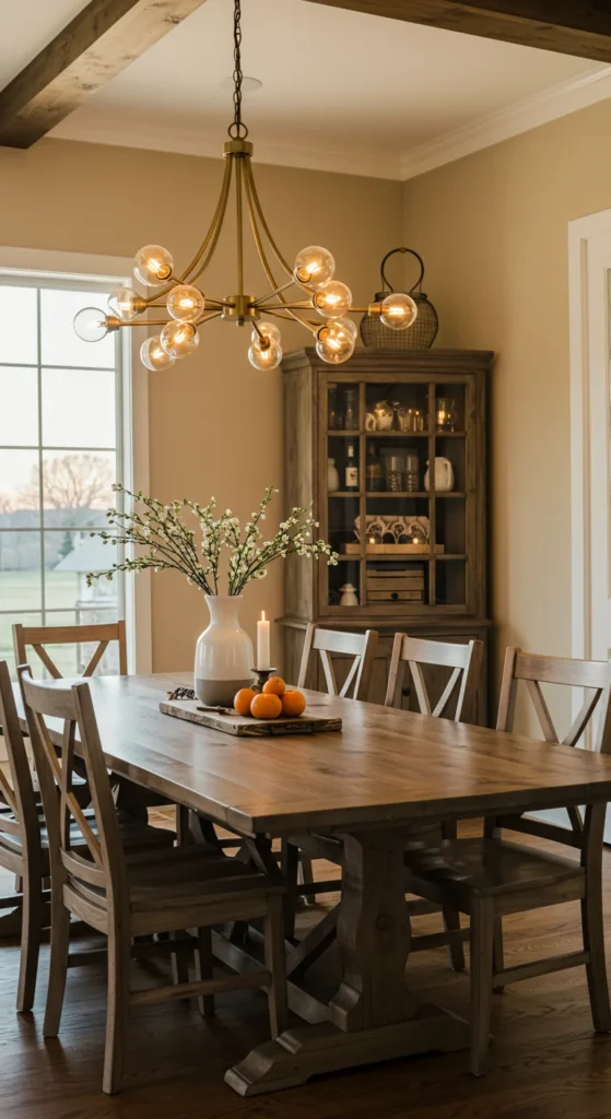 Use multiple light sources for ambiance. Overhead fixtures for general light, sconces for glow, and candles for mood. Combine warm tones so nothing feels harsh. Layered light gives your dining room depth and comfort.