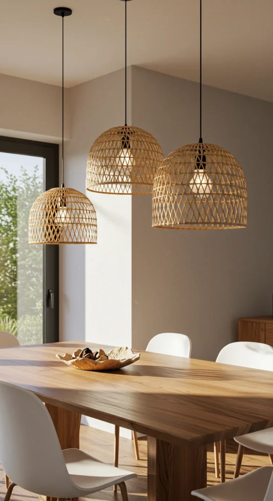 Woven pendants bring warmth and texture. They diffuse light softly, creating a relaxing glow. Perfect for coastal or boho styles. Group two or three for visual impact over longer tables.